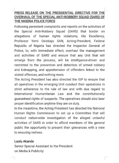 “Following persistent complaints and reports on the activities of the Special Anti-Robbery Squad (SARS) that border on allegations of human rights violations, His Excellency, Professor Yemi Osinbajo SAN, Acting-President, Federal Republic of Nigeria, has directed the Inspector General of Police to, with immediate effect, overhaul the management and activities of SARS,” .